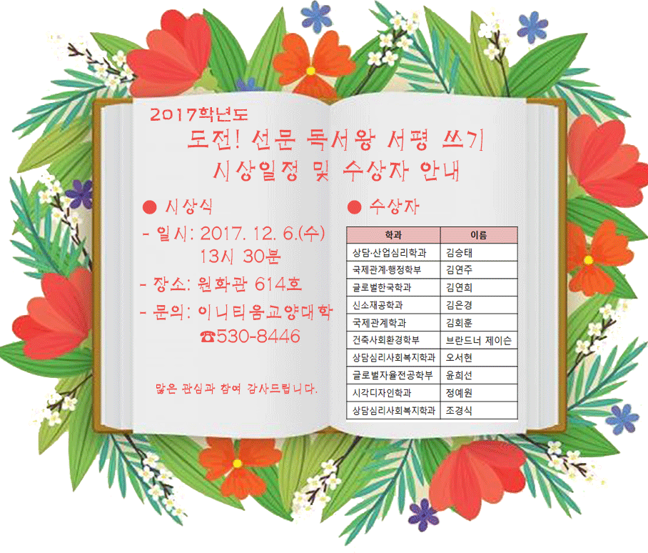 2017학년도 도전! 선문 독서왕 서평 쓰기 시상 일정 및 수상자 안내를