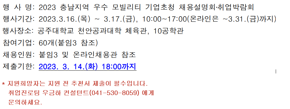 2023 충남지역 우수 모빌리티 기업초정 채용설명회, 취업박람회 신청 안내