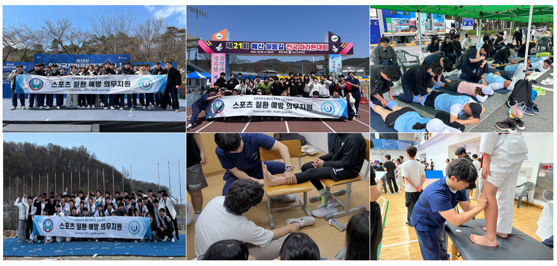 선문대학교 물리치료학과의 동아리 ‘건강지킴이’는 스포츠 물리치료를 기반으로 지역사회를 위한 다양한 봉사활동을 펼치고 있습니다. 마라톤 의무지원 봉사활동과 교직원을 대상으로 물리치료 봉사활동 등을 통해 전공지식을 실천에 옮기며, 지역사회에 따뜻한 손길을 전하고 있습니다.
